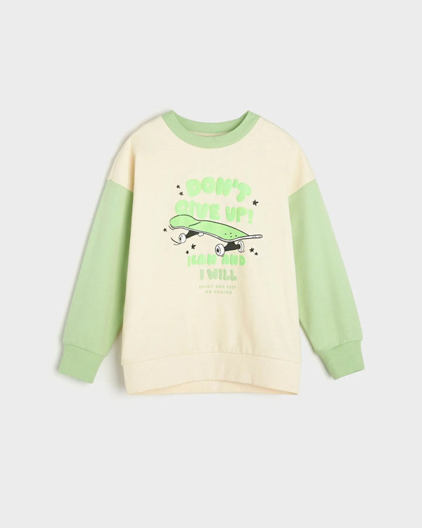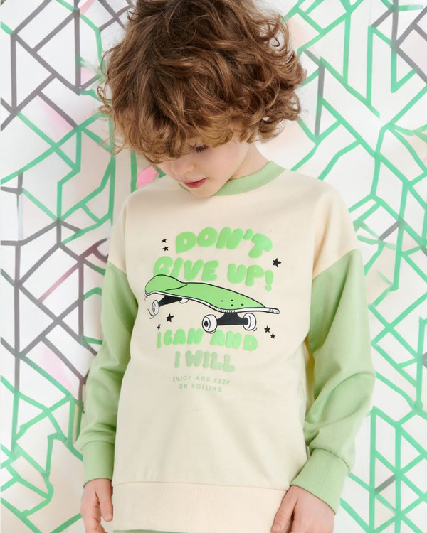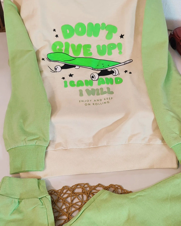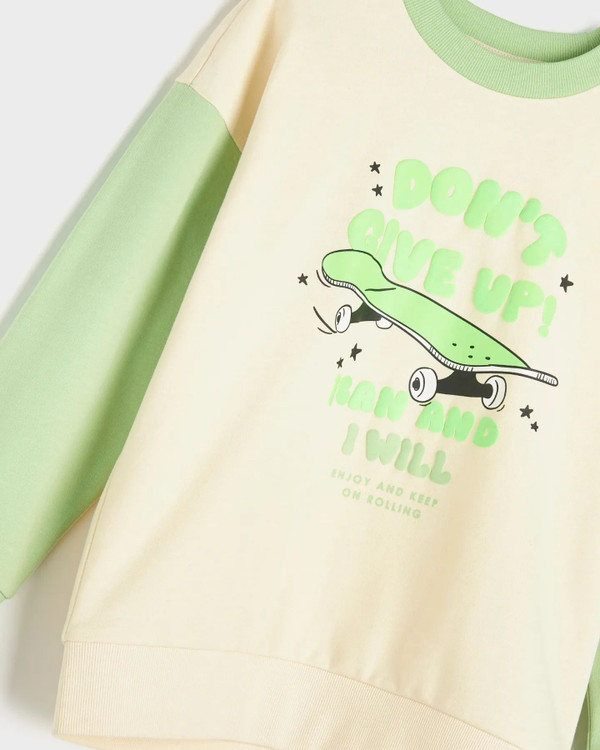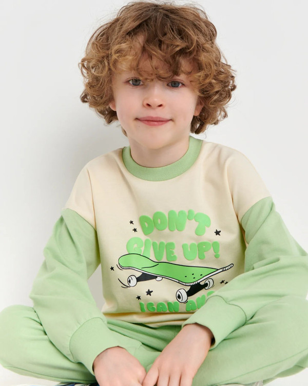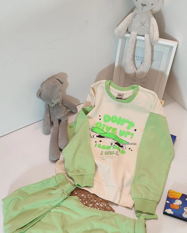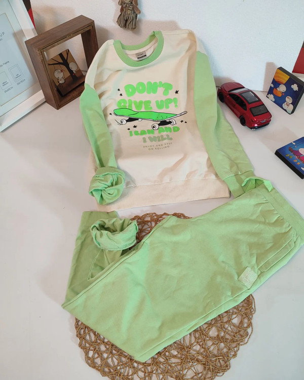 ست سویشرت شلوار پسرانه طرح اسکیت بورد برند sinsay آلمان رنگ سبز پسته ای و کرم